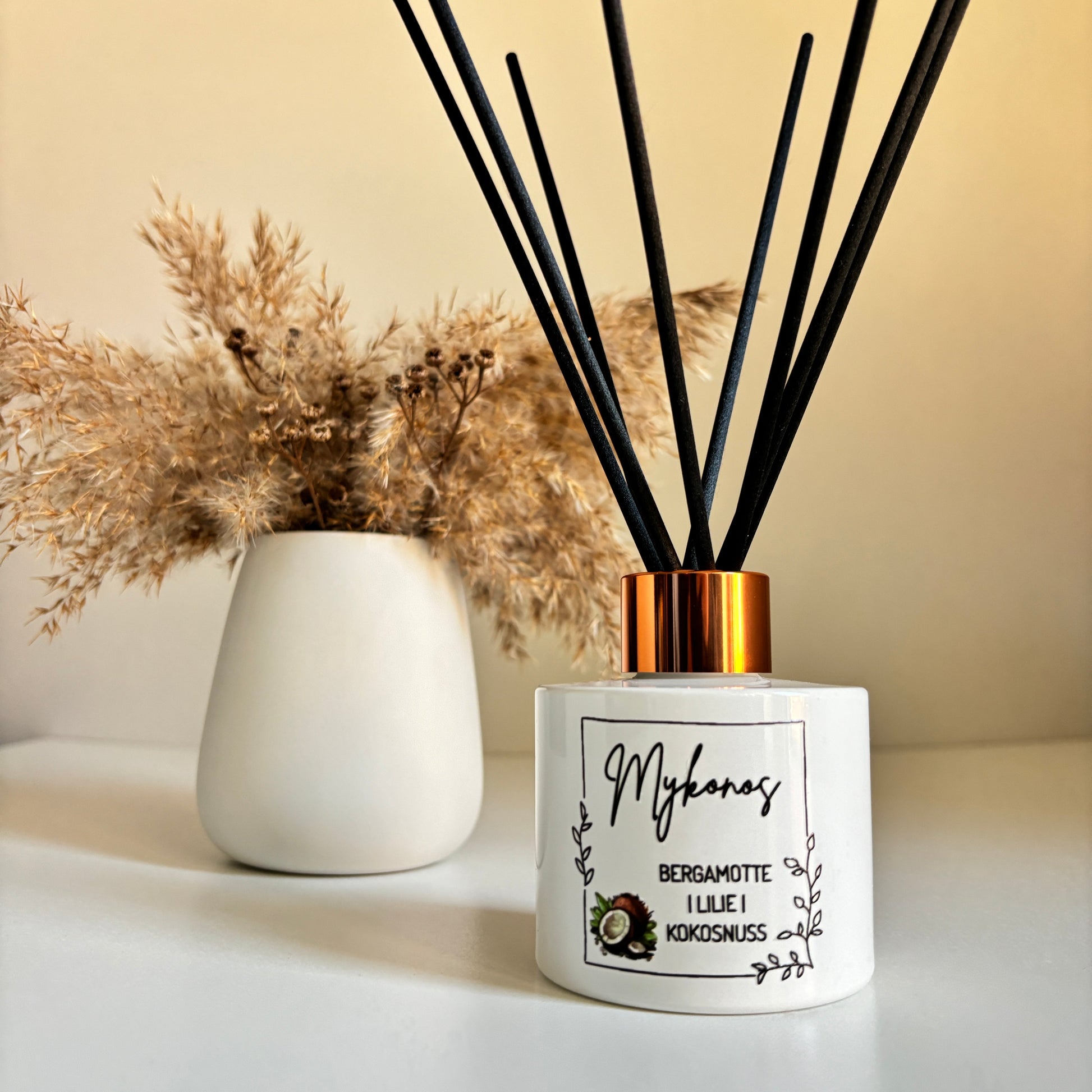 Mit dem Raumduft "Mykonos" holen Sie sich das unvergleichliche Gefühl einer frischen Meeresbrise und strahlender Sonnenstunden direkt nach Hause. Die spritzige Bergamotte verleiht eine belebende Leichtigkeit, während sanfte, maritime Noten und die elegante Blüte der Lilie die Sinne verwöhnen. In der warmen Basis entfaltet sich ein Hauch von Kokosnuss, der an entspannte Stunden am weißen Sandstrand erinnert.